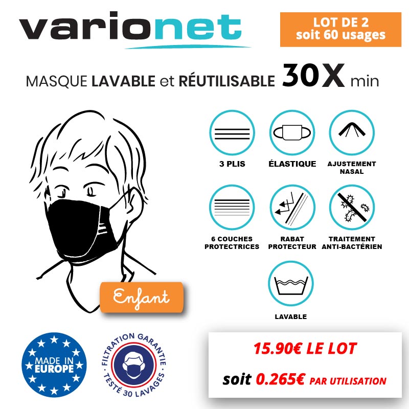The Varionet face mask is an economical, ecological, innovative and high-performance protective mask. This barrier mask is washable up to 30 times at 60° and is reusable, i.e. one mask per month ! Thanks to its "3-ply" design, it adapts easily to different faces and is equipped with a soft metal reinforcement for a perfect and comfortable nasal fit.